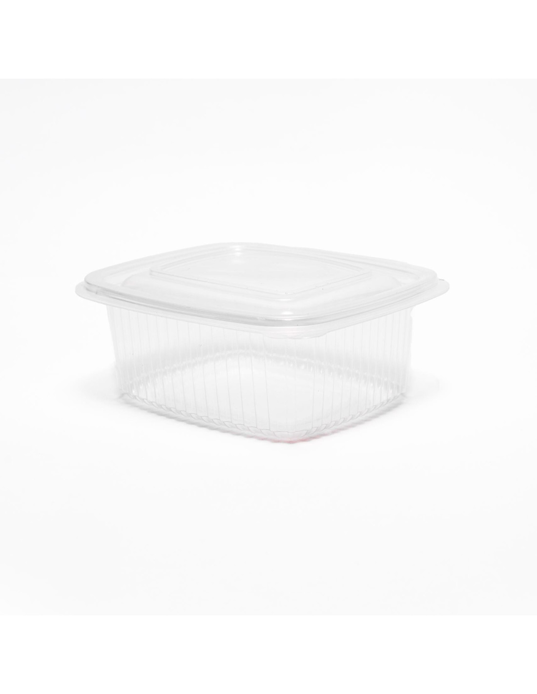 Envase PP para alimentación 500cc. con tapa bisagra. Apto para microondas, congelador y lavavajillas. Reciclable y reutilizable hasta 25 ciclos de lavado. Caja 600 uds